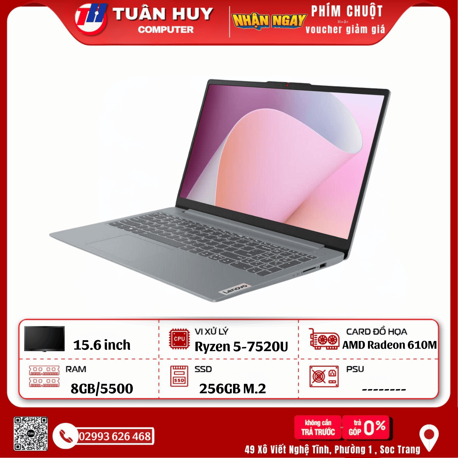 Về cấu hình, Lenovo IdeaPad Slim 3 15AMN8 sử dụng chip AMD Ryzen 5 7520U (4 nhân, 8 luồng, xung nhịp tối đa 4.3 GHz), kết hợp 8GB RAM LPDDR5 (tốc độ 5500 MHz) và ổ cứng 256GB SSD PCIe NVMe. Đây là bộ ba hoàn hảo cho các tác vụ hàng ngày như học online, soạn thảo văn bản, xem video Full HD hay thậm chí chơi game nhẹ nhờ GPU tích hợp AMD Radeon 610M.